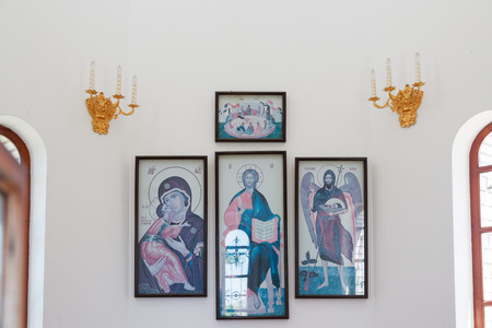 Russia, Poltavskaya village - 31 December 2015: Orthodox Christian icons on the wall, glued wallpaper.
