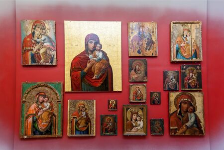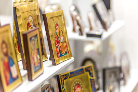 Demre, Turkey - May 21, 2019: Orthodox icons on the shop counter