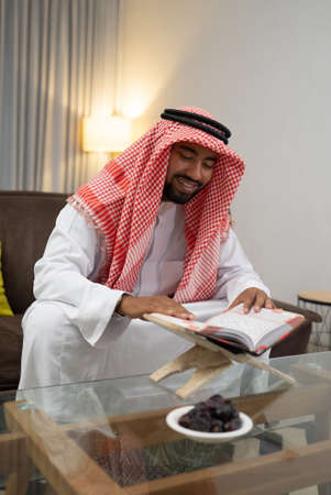 muslim book with arabic calligraphy Quran translation : holy book of Muslims and oud perfume, dates fruit and glass bottle, iftar ramadan concept