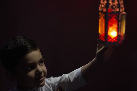 Muslim boy touching traditional Arabic lantern candle blowing in the dark. Middle-eastern boy praying. Thanking god. Ramadan, Eid-al-Adha concepts