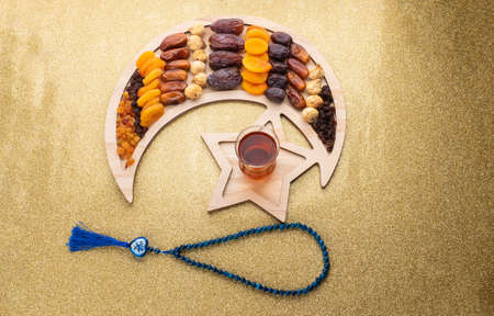 Golden Ramadan moon decor with Islamic rosary beads and dates fruit.