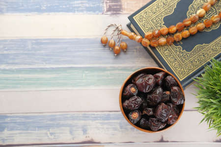 Quran Kareem , wooden rosary , SAFAWI dates on wooden background