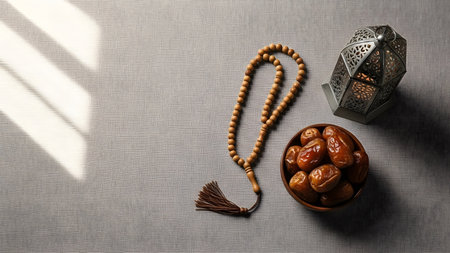 Ramadan kareem holy month fasting concept dates tasbih lantern on gray background