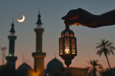 A Ramadan lantern with a mosque in the background during the evening time. The lantern is glowing and the mosque is silhouetted against the sky. Religious and traditional.