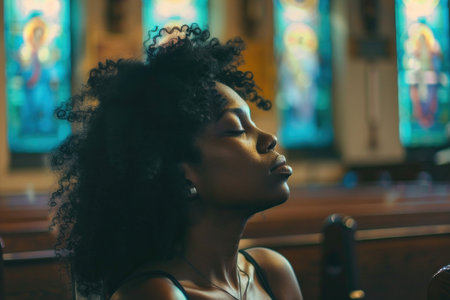 An attractive woman is praying in a church, her hands clasped together as she closes her eyes in a moment of reflection and peace.