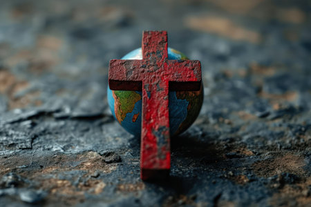 Retro Vintage Jesus Christ Cross near Earth Globe extreme closeup. Generative AI