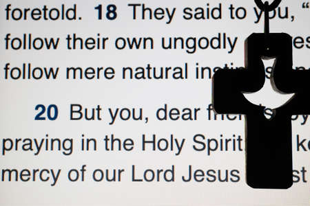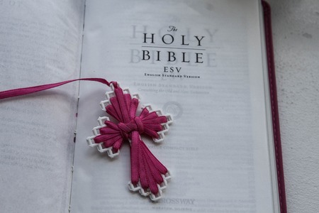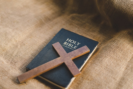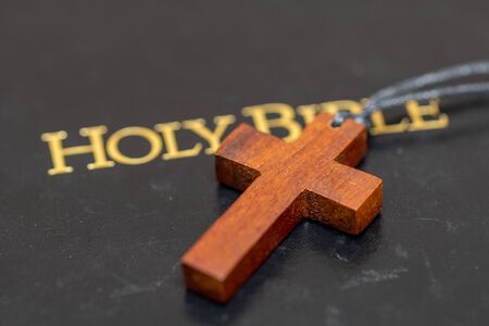 Christian cross necklace on Holy Bible book, Jesus religion concept as good friday or easter festival
