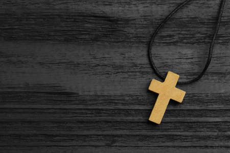 Christian cross on black wooden table, top view. Space for text