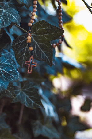 Wooden rosary with cross - with bokeh in background