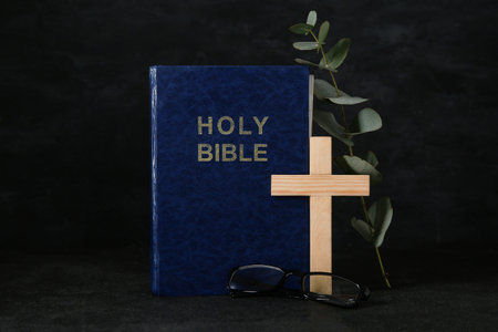 Holy Bible with eyeglasses and wooden cross on black background