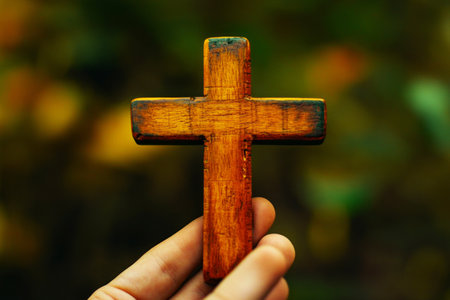 A wooden cross held gently in a hand, set against a blurred green and orange background, symbolizing faith and hope in a peaceful, spiritual atmosphere