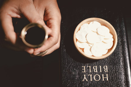 Hands holding communion bread with a wooden bowl and wine cup, symbolizing Holy Communion, the Eucharist, the sacrifice of Jesus Christ and Christian faith in the Lord Supper.