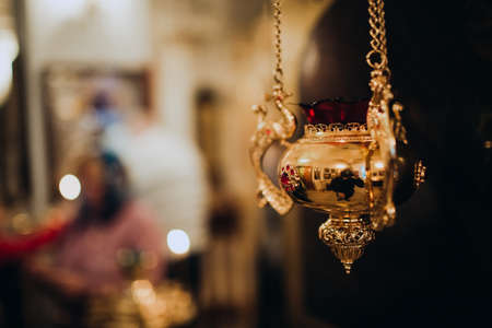 Close up detail view of christian hanging oil candle of brass and glass, hanging in church in front of religious iconography and iconostasis