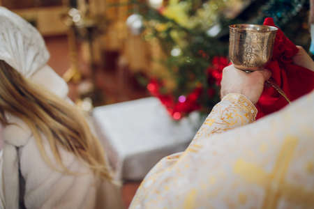 Religious Feast of Corpus Christi. Holy communion in church. Taking holy . Priest celebrate mass at the church. Cup with red wine, bread. Eucharist. Christian Catholic prays, holy grail