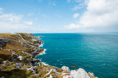 Dramatic coastal cliff path winding along a rugged seascape with turquoise ocean waves crashing against the weathered rocky shore Serene and peaceful natural landscape