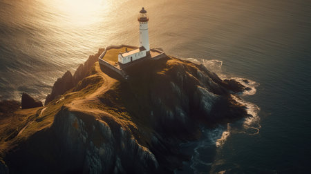 A breathtaking aerial view of a lighthouse standing on a rock surrounded by vast liquid water, showcasing the beauty of natural landscape and perfect for leisure and recreation AIG50