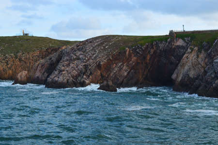Rocky coastline with cliffs and waves. Lighthouse at the top of the rocky cliff.