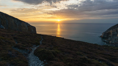 Hiking path at coast near Cap de la Chevre with heather covered landscape at sunset, Crozon, Parc naturel regional d'Armorique Brittany, France