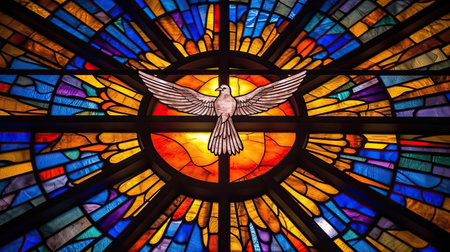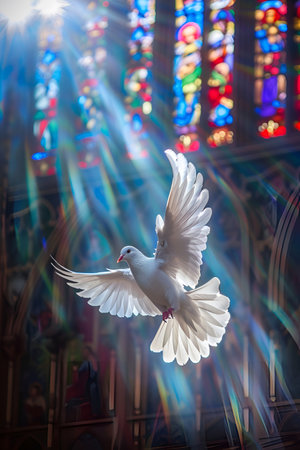 A white dove gracefully flying in a church, illuminated by beams of colorful light from stained glass windows, symbolizing peace and spiritual presence.