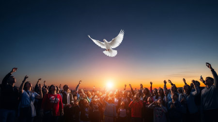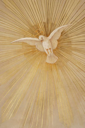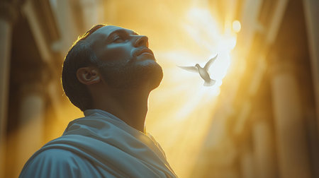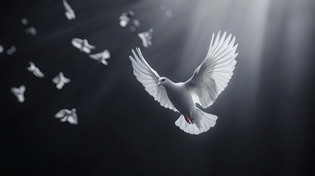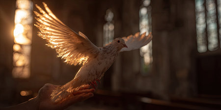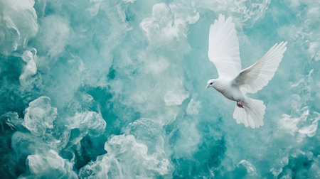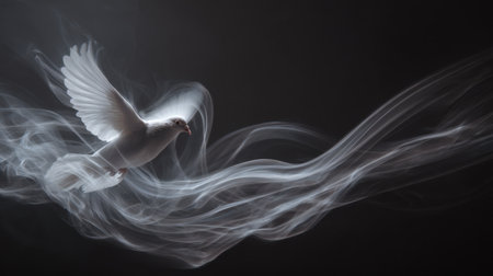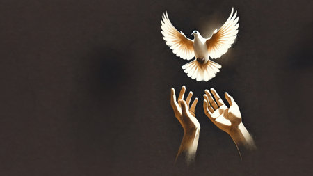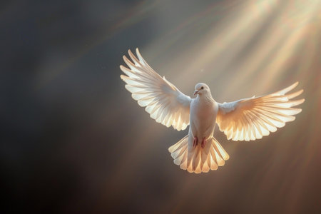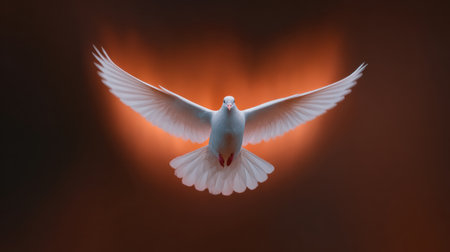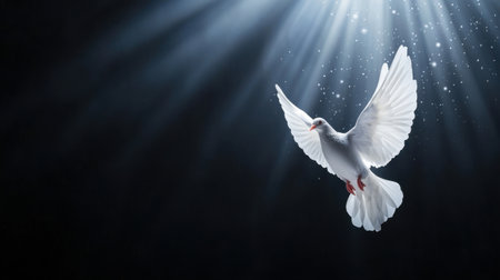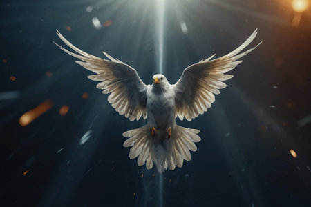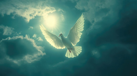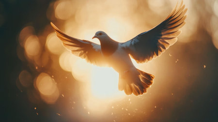 A dove with glowing wings hovers in the sky, a symbol of the Holy Spirit presence and guidance in the lives of believers