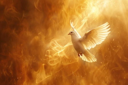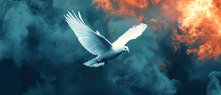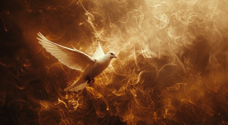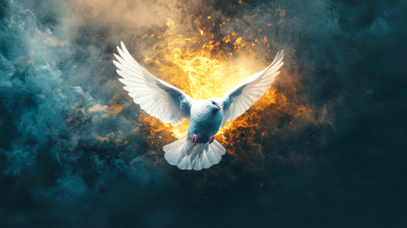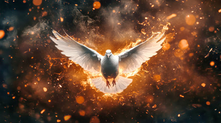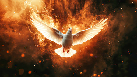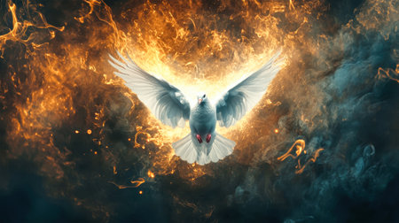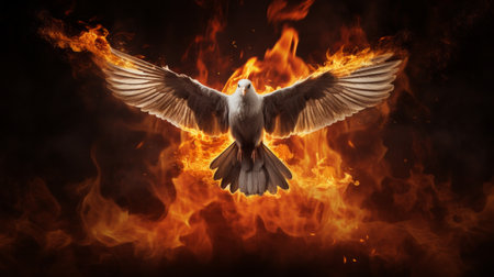 A winged dove engulfed in flames, symbolizing the Holy Spirit of the New Testament, with ample copy space.