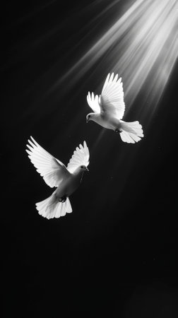 Two white doves fly on a black aesthetic background with sun rays. Peace concept. Generative AI.