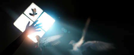 Power of hope and faith, Abstract, Woman hand and free bird enjoying nature on window background, Religion concept.