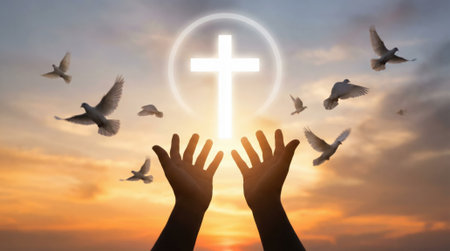 A persons hands raised in prayer towards a luminous cross surrounded by doves against a beautiful sunset sky, symbolizing faith, hope, and salvation.