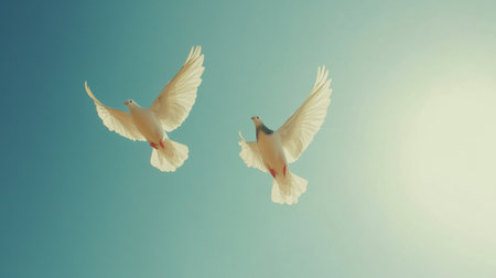 An enchanting shot of two doves in flight against a bright blue sky, their wings spread wide, symbolizing freedom and unity in nature