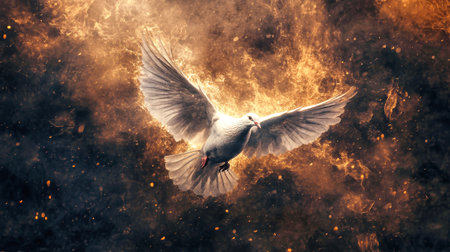 Captivating image of a dove in flight surrounded by ethereal flames, symbolizing hope and resilience