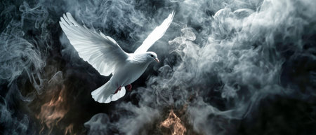 A white dove takes flight from flaming embers, surrounded by dark smoke in a striking digital art composition.