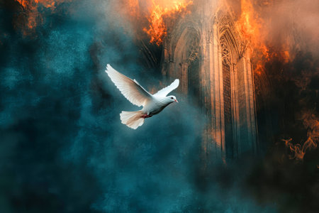 A dove gracefully flies from shadows, surrounded by flames and smoke, symbolizing peace against a mysterious church backdrop.