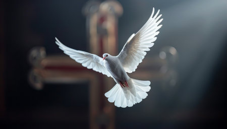 A white dove soars majestically through the air, its wings fully spread, capturing a moment of freedom and peace. Behind the bird, a large cross is subtly illuminated by soft light filtering through an unseen source, creating a serene atmosphere that evokes calmness and spirituality.