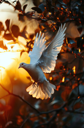 Majestic white dove spreads its wings in a tranquil flight, bathed in the warm glow of sunlight
