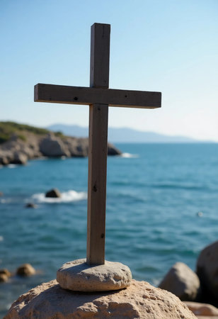 A wooden cross is placed firmly on a rock by the sea, bathed in the soft glow of the sunrise.