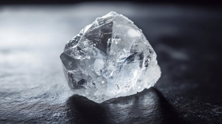 A rough, uncut diamond with natural clarity, displayed elegantly against a dark background.