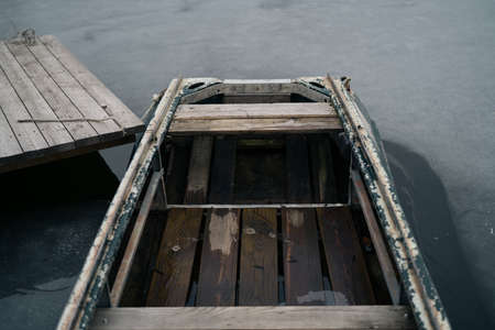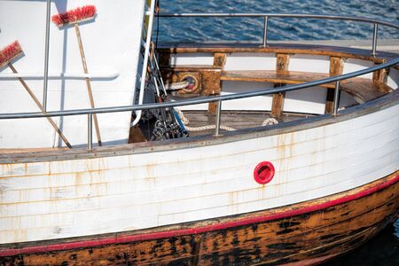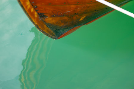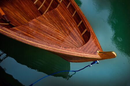 Wooden fishing boat bow in seaside marina, nautical vessel moored to a dock
