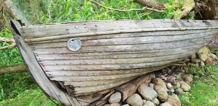 Part of old wooden viking boat in norwegian nature. Tourism and traveling concept