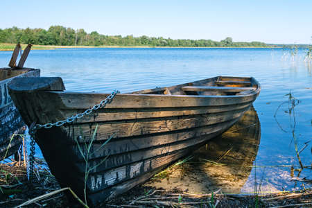 Abandoned old wooden fishing boats on the shore on a summer sunny day