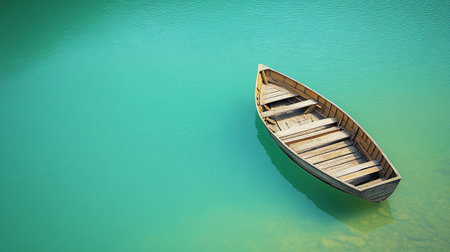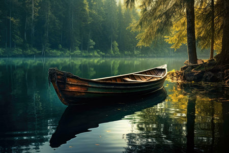 old wooden fishing boat, fishing boat in a calm lake water, wooden fishing boat in a still lake water