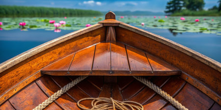A beautifully crafted wooden boat navigates calm waters filled with blooming lotus flowers. The sky above is clear, showcasing a peaceful atmosphere that invites relaxation.