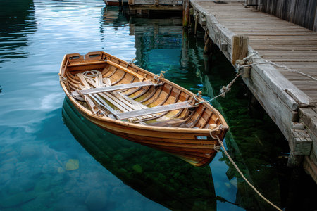 A beautifully crafted wooden boat floats quietly in clear water, anchored by a dock at dawn.