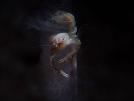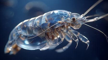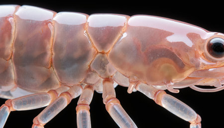 Underwater marvel reveals intricate details of a stunning marine creature. Its translucent body glistens, showcasing delicate textures and patterns against a dark backdrop.
