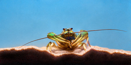 Single alive crayfish moves its claws and limbs in clear blue water background. Close up front view of crayfish. Catching crayfish for human consumption. Close-up.