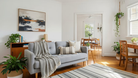 This image features a modern living room interior with a grey sofa, wooden furniture, and various decorative plants. The room includes a striped rug, a coffee table, and an abstract painting on the wall. The image is set on a transparent background, making it suitable for various design applications. Key elements include a cozy and stylish ambiance with natural light streaming in through the windows.