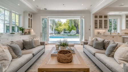 Bright and airy open-plan living area with large windows and doors providing a view of a pool and outdoor space. A light-colored couch, several decorative throw pillows, and a natural wood coffee table are central features. Neutral colors and simple lines create a contemporary and elegant aesthetic.