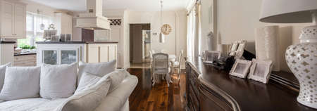 Luxury living room with white furniture, modern kitchen and dining area