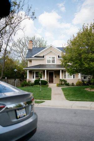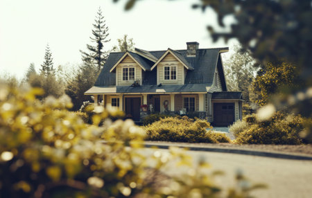 A well-maintained two-story house is showcased, featuring dark gray siding and white trim. The composition highlights a garage door, multiple windows, and a welcoming entrance. The scene is bathed in natural light, suggesting an outdoor setting suitable for various commercial purposes. The architectural design is contemporary, emphasizing clean lines and modern aesthetics.