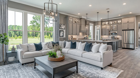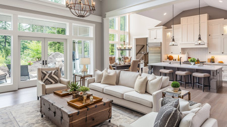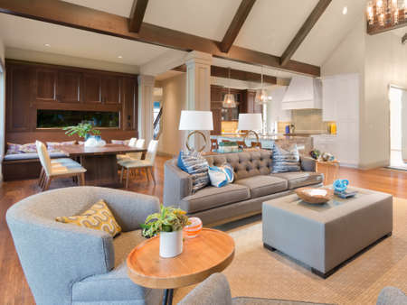 Beautiful living room and kitchen in new traditional style luxury home