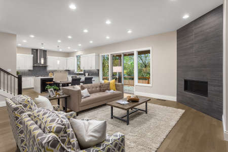 Living room and kitchen in new modern home with open concept floor plan.